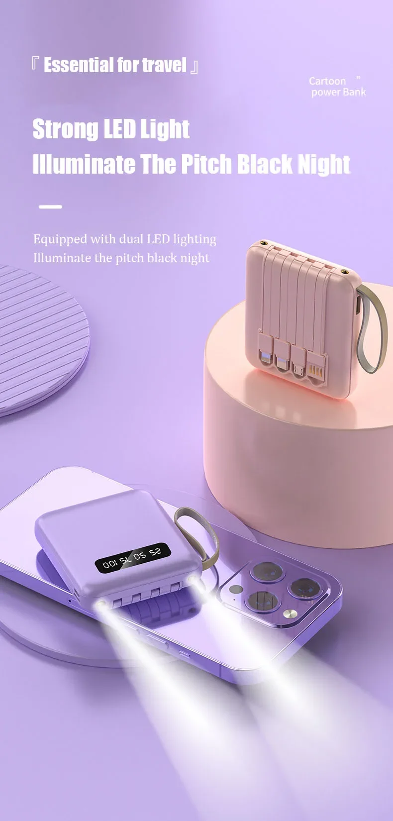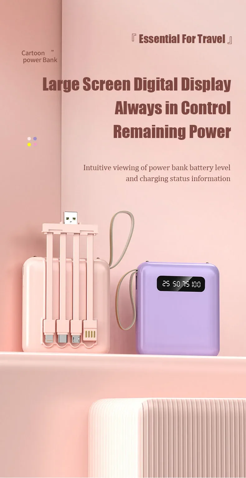 Phone Power Bank with 4 Charing Cables Mini Large Capacity Mirrored Power Bank Portable Fast Charging Powerbanks 20000 10000mAh