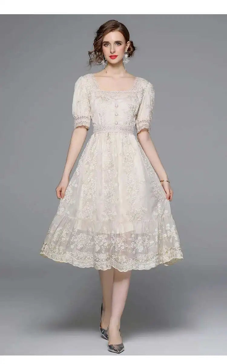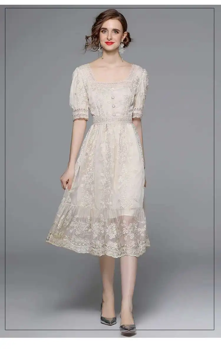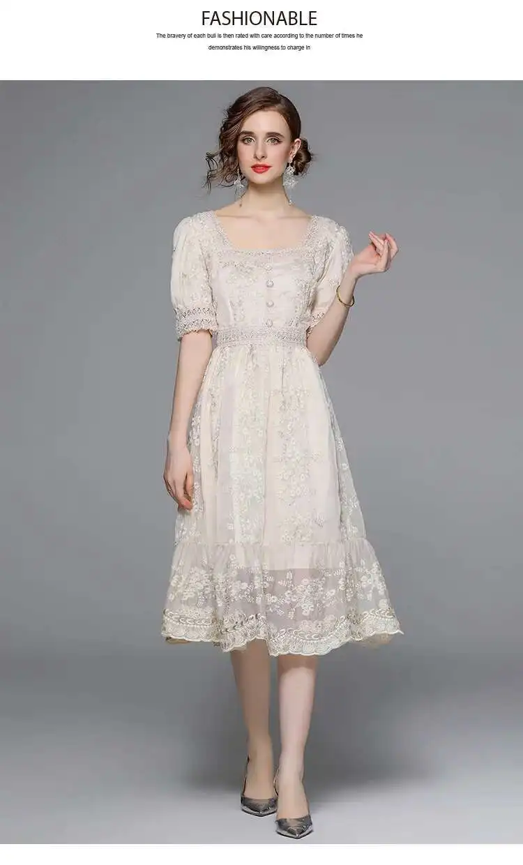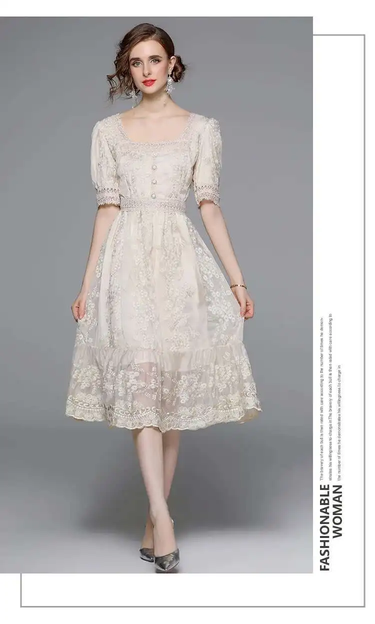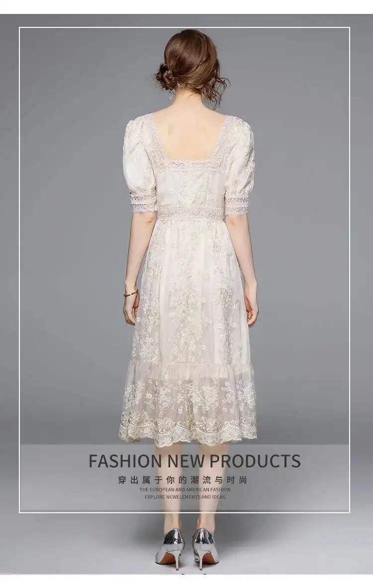 Flower Embroidery White Lace Prom Dresses Women Short Sleeve Fashion Dress Female New Style