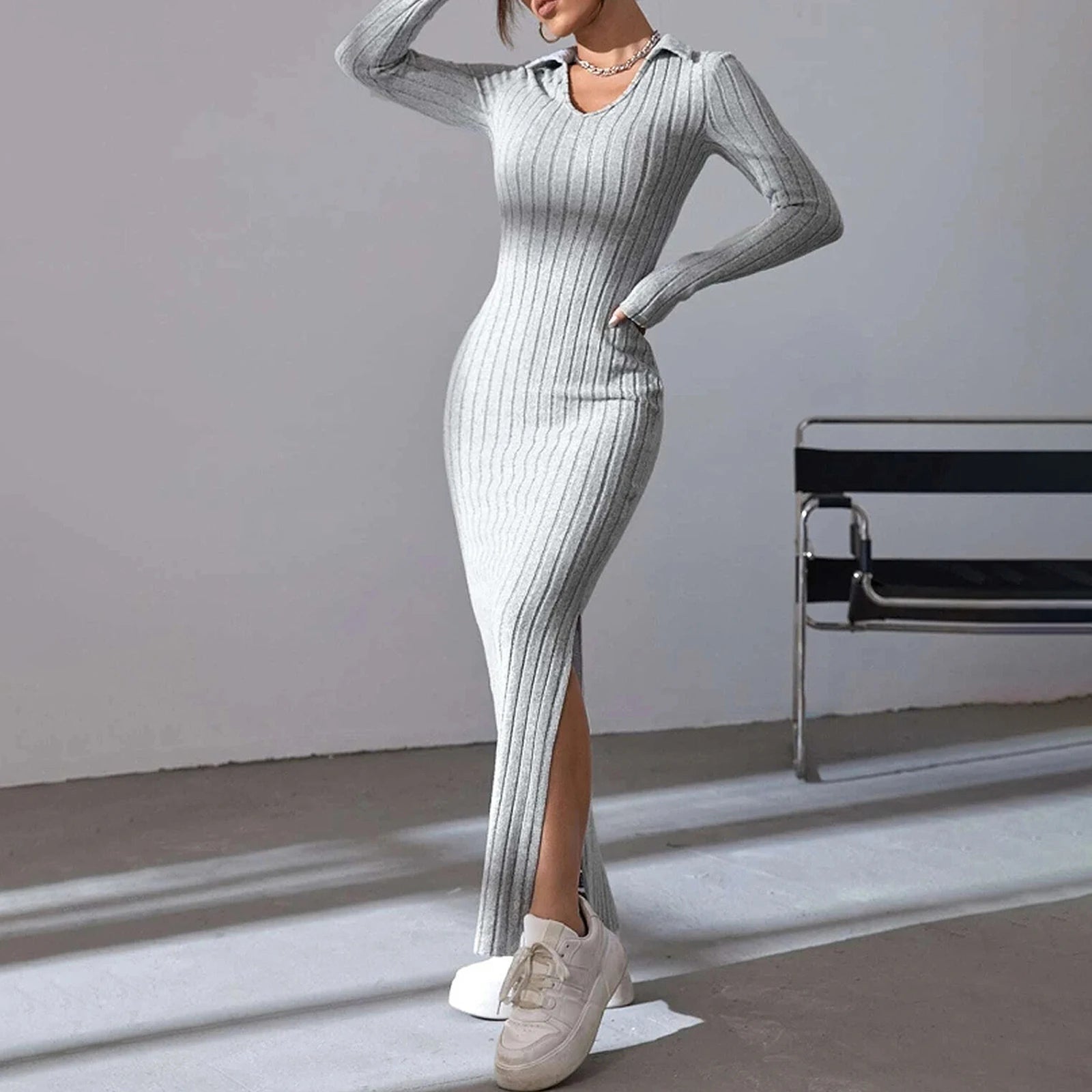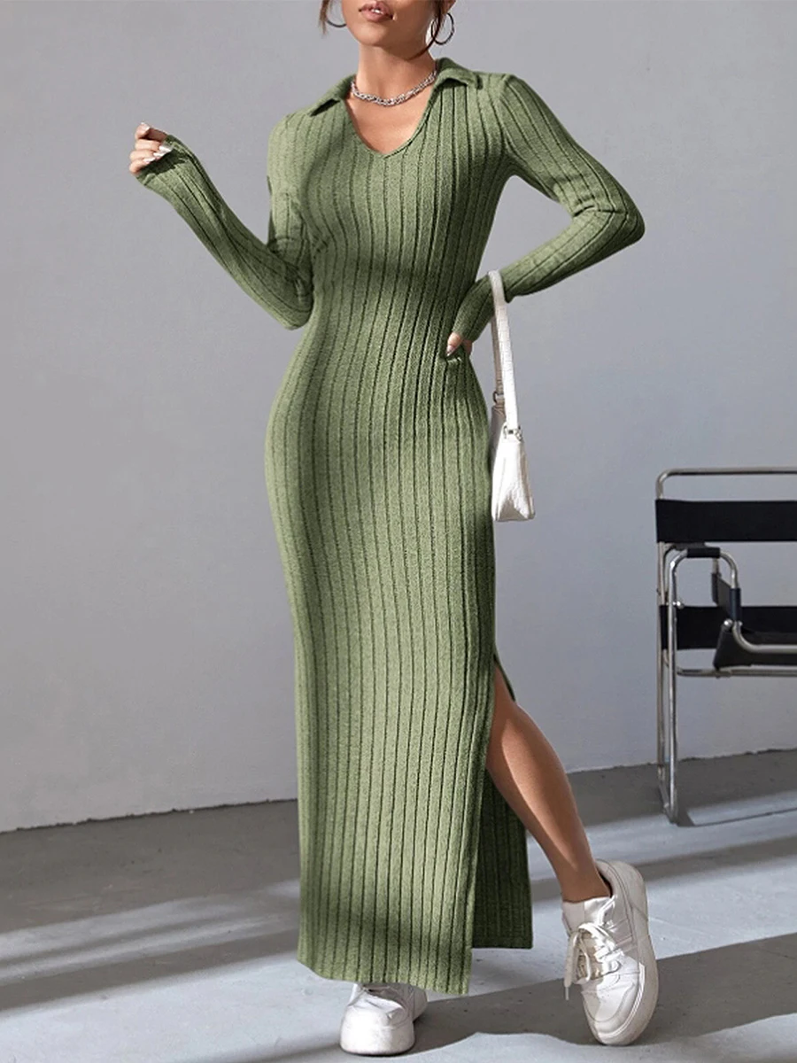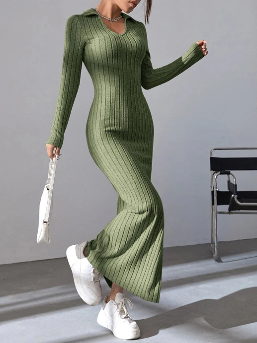 Women's Fall Winter Knitted Dress Long Sleeve Lapel Collar Solid Color Bodycon Long Dress