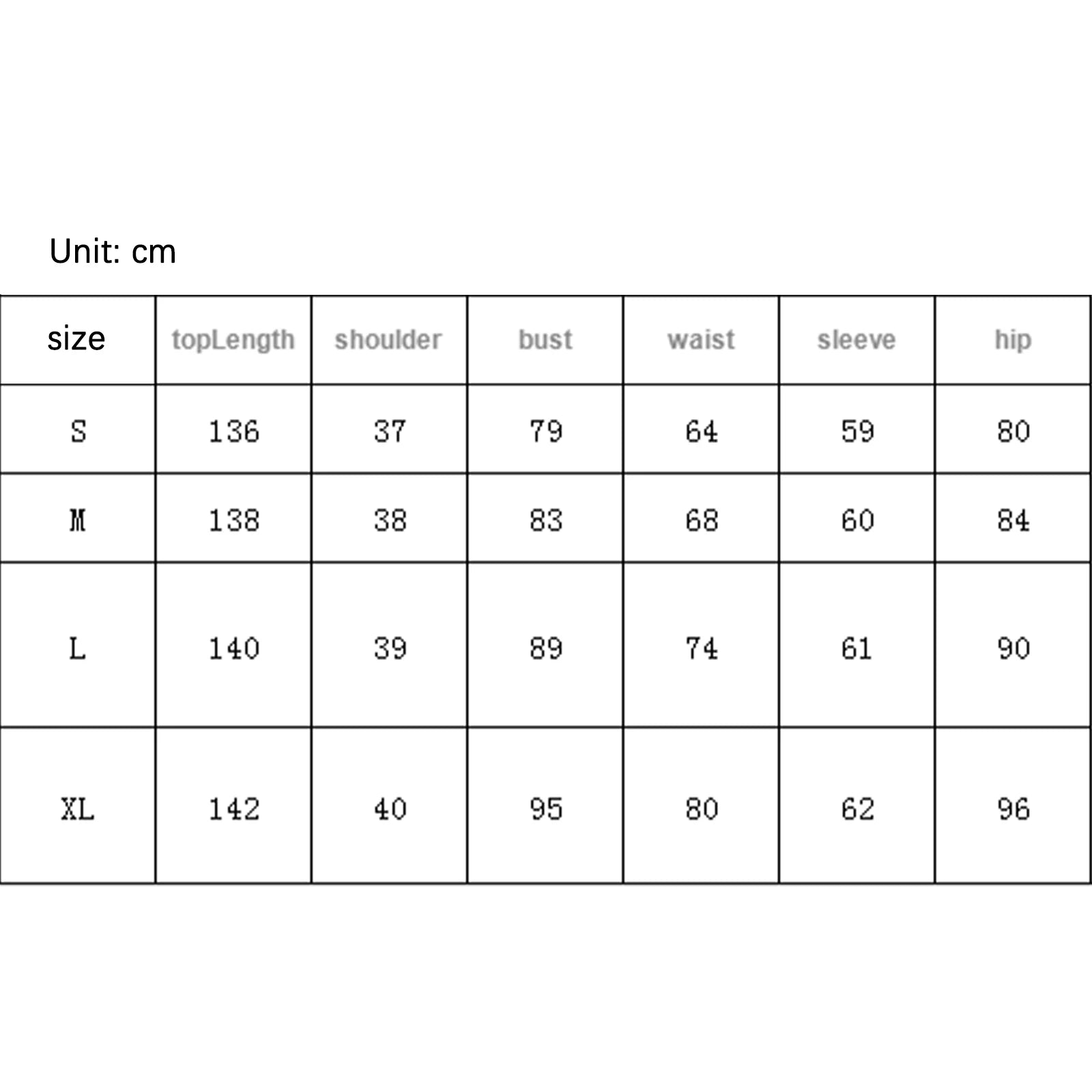L Length: 140 Bust: 89 Sleeve: 61 Shoulder: 39 Hip: 90